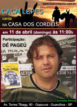 03 abr CACÁ LOPES NA CASA DOS CORDÉIS EM GUARULHOS Posted on 03/04/2010In A História de Guaianases em Cordel Cordel Social da AVIB Cordel: A Invasão do Estrangeirismo Cordel: Bullying - Uma Tortura SocialBy Cacá Lopes You might also like A invasão do estrangeirismo no ENEM Posted on nov 16, 2021ago 05, 2023 EP Fartura – lançamento de quatro músicas inéditas Posted on ago 19, 2021ago 05, 2023 O canto do santo de casa virou cordel e música Posted on nov 28, 2020ago 06, 2023 Deixe um comentário Cancelar respostaCommentName * Email * Website Δ Navegação de Post Previous Previous post: CACÁ LOPES EM GUARULHOSNext Next post: CACÁ LOPES CANTA NA USP